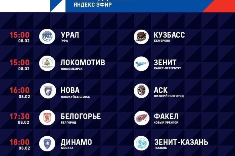 8 февраля, суббота 22.00 (югр.). «Динамо-ЛО» — «Югра-Самотлор» 17.00. «Локомотив» — «Зенит» СПб 17.00. «Урал» — «Кузбасс» 18.00. «Нова» — АСК 19.30. «Белогорье» — «Факел» 20.00. «Динамо» М – «Зенит-Казань» Трансляции всех матчей на портале «Старт» : http://tvstart.ru